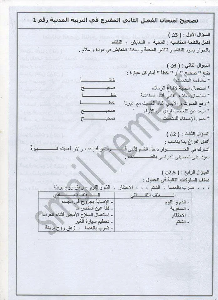 اختبارات الفصل الثاني في مادة التربية المدنية للسنة الرابعة ابتدائي