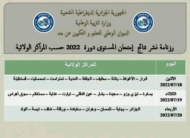 نعلم جميع الناجيحن في امتحان المستوى دورة ماي 2023 أن استخراج شهادة اثبات المستوى يكون حسب الرزنامة التالية الموضحة في الجدول حسب المراكز الولائية مقسمة الى يومين :